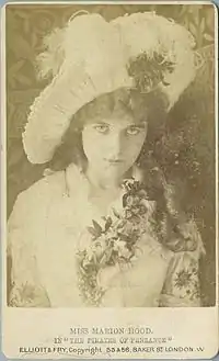 In 1891, Hood returned to London in a burlesque of Joan of Arc, or the Merry Maid of Orleans (by Adrian Ross and J. L. Shine).[3] A reviewer wrote, "Miss Marion Hood makes an attractive Joan of Arc, sings the airs allotted to her so as to win plenty of applause, and only fails where the delivery of certain declamatory speeches overtaxes the strength of her voice."[4] She also toured in Australia in 1892 in Carmen up to Data among other things. Her last appearance on the London stage may have been as a member of the crowd in court in Trial by Jury at the Nellie Farren benefit in 1898.