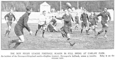 1921 was another good year for Maritime though they could only manage runner up in the Monteith Shield and remarkably managed to lose the Roope Rooster final for the 4th straight time. They had earlier beaten Marist 10–8 in round 1 though the league ordered the match replayed after Marist complained that the referee had blown the game off before time was up.[19] Maritime won the replay 21-10 and then the semi final 12–7 over Fire Brigade.[20][21] Maritime's loss in the final came at the hands of City Rovers 30–14.[22] During the season Maritime made history when they were the first team to ever play on Carlaw Park on June 25 alongside City Rovers. They lost the match 10–8.[23] Future New Zealand representative Ivan Littlewood had joined the side and finished second in the try scoring lists with 12 tries for the season. They were also joined for the 1921 and 1922 season by Australian professional boxer Mike Flynn who spent a large amount of time in the early 1920s in New Zealand and later joined the City Rovers in 1923.