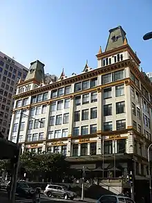 After first establishing their store on Oxford Street in 1885,[1] the Foy brothers opened 'Mark Foy's Piazza Store in 1909 on Liverpool Street. This was a three-storey store (two floors plus basement) designed by architects Arthur McCredie & Arthur Anderson with a turreted mansard roof.[2] The building was partially modelled on the Parisian Le Bon Marche department store. Its piazza, chandeliers, marble and sumptuous ballroom made it a Sydney institution and one of Australia's foremost fashion stores. The store had Australia's first escalator.[1] The store stretched around a whole city block and gave rise to the colloquial saying, when referring to a person of overweening confidence, "You've got more front than Mark Foy's."[3] The store was remodelled in 1927.[2] The store was linked in 1926 to the newly opened Museum Railway Station[4] by underground subway.[5]