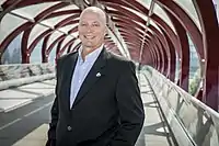 ![]() Mark Hlady standing on the Calgary Peace Bridge in his home riding of Calgary-Mountain View in 2018 | |