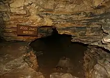 According to folklore, McDowell used the cave as a secret Confederate weapons storage cache during the American Civil War. McDowell was an ardent Southern supporter, and indeed had a stash of cannons and muskets, previously intended to aid the rebels in his home state of Kentucky in 1846, stockpiled at his St. Louis medical college, as evidenced when an angry mob gathered outside the building, mistakenly accusing McDowell of murder.[10][11] One of the former Confederates who likely had knowledge of the cave from his war service is the legendary outlaw Jesse James. James had ridden with Quantrill's Raiders and Bloody Bill Anderson throughout the Little Dixie area southwest of Hannibal. In September 1879, following the robbery of a train in nearby Saverton, Missouri, the cave proved a ready and secure hideout for few days rest. James even signed and dated one of the caves walls using a pencil. That section of the cave used to be open to tours but has since been excluded from the tour as the pencil marks have faded.