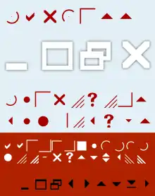 | 6x | ✔[lower-alpha 1] | ✓ | 🭽 | 🭿 | ⎾[lower-alpha 3] | ⏌[lower-alpha 4] | ⬛[lower-alpha 1] | • | ● | ◜[lower-alpha 5] | ◞[lower-alpha 6] | ◜[lower-alpha 7] | ◞[lower-alpha 8] | ⬤[lower-alpha 1] | 🮞 | |