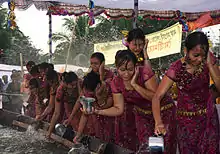 Marmas follow the Burmese calendar. They celebrate the New Year, called Sangrai (သင်္ကြန်), which begins on the first day of Bohag.[8] They make sangraimu, which is a form of traditional cakes. They take part in Sangrain Relong Pwe (သင်္ကြန်ရေလောင်းပွဲ; water pouring), where young Marma men and women spray each other with water. Sangrai is celebrated in three days, On the 1st day, called Painchwai or Akro, homes are decorated with flowers. On the 2nd day, Sangrai Akya, Marmas participate in traditional sports, dances, cultural activities and hold meetings regarding community issues. They also go to monasteries to participate in the Buddha statue's bathing (cleansing) ritual on this day. On the 3rd day, called Sangrai Atada, they cook a vegetable dish made out of more than 100 ingredients, called hangbong (ဟင်းပေါင်း; pachan in Bangla).[9]