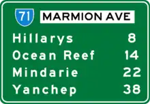 Marmion Avenue is part of State Route 71, from the southern terminus to Hester Avenue, continuing on from West Coast Highway. It commences in Trigg, traveling generally parallel with the Indian Ocean coastline, and the other north-south arterials Mitchell Freeway and Wanneroo Road, through mostly residential areas and some undeveloped land north of Currambine, and terminates in Yanchep. Marmion Avenue is managed by Main Roads Western Australia after previously being managed by the City of Joondalup from Ocean Reef Road to the City of Joondalup-Wanneroo boundary, and the City of Wanneroo for the rest of the road.[2][3]