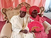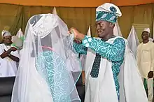 The various marriage ceremonies performed in Africa begin with the initial introduction between the groom and bride. The Yoruba call this ‘Mo mi i mo e’ (know me and let me know you) while the Igbo call it ‘Ikutu aka n’ulo’ (Knock on the door).[4] The family is typically involved within this process. Within many African communities, such as Nigerian ethnic groups, the engagement is where the traditional practices are performed.[5] It consists of an elaborate ceremony with heavy involvement from both families. The families dress in traditional and often colourful attire. It is common for the families to choose a colour to abide to in their dress code. The ceremony is typically held at the Bride's house. It is here that payment from the groom's family to the bride's is made and wedding rings are exchanged. Traditional customs relevant to the specific community are performed during this engagement ceremony, while the more modern marital customs will be performed at the religious wedding ceremony.[5] The wedding will consist of more modern marital customs relevant to the religion of the participants families. Examples of this include the exchange of marital vows and modern wedding attire being worn by the bride and groom.