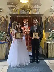 At the end of the service, the couple stands at the foot of the altar. From the beginning, at the back of the church, they have now progressed to the forefront. Only the eternal Kingdom of Jesus Christ, as signified by the Altar, remains ahead of them. The couple's final act is to turn and face the assembled Church. Through this sacrament, they have become an icon of the Church and icon of Christ and the assembly comes up to congratulate them and share in their joy. The couple receive the icon of the Christ and the icon of Theotokos.