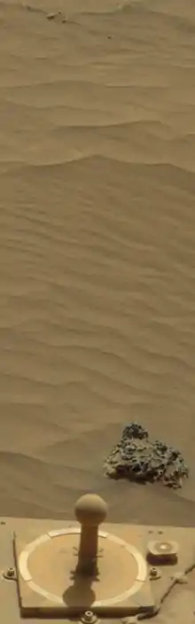 The MarsDial is a sundial that was devised for missions to Mars. It is used to calibrate the Pancam cameras of the Mars landers. MarsDials were placed on the Spirit and Opportunity Mars rovers, inscribed with the words "Two worlds, One sun" and the word "Mars" in 22 languages.[1] The MarsDial can function as a type of sun-dial known as a gnomon, in modern times this is the stick part of a sundial.[2][3] A gnomon type sundial is basically a "stick in the ground" design, but by looking at the length and direction of the shadow the time of day can be calculated.[2] The sundial can also be used to tell which way is North, and to overcome the limitations of a magnetic north different from a true north.[2]