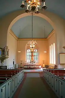 The pulpit is from 1691 and was built in baroque design. Rebuilding in 1852 has changed the pulpit into a more neoclassical style. An octagonal baptismal font with neoclassical design is made in 1912 after drawings by architect Ture Gabriel Schaar (1864-1945).[4][5]