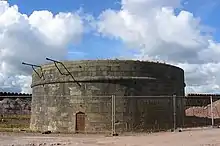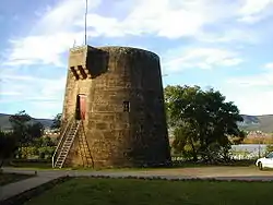 The British built five Martello Towers between 1832 and 1835 at Grand River North West (2), Black River (2), and Port Louis (1), of which three survive. One tower, named Cunningham Tower after Lieutenant-Colonel Cunningham, the commanding Royal Engineer, was constructed as part of Fort George at the northern side of the entrance to Port Louis harbour. Two towers were built at Grand River North West; on the south-west side of the river bay the tower was built at Pointe aux Sables whilst Fort Victoria was built covering the north-eastern flank. The remaining two were built to support existing batteries, which were also improved, at the mouth of the Black River; one to the north at La Preneuse and the other south of Grande-Rivière-Noire at Batterie de l'Harmonie. Cunningham Tower disappeared after 1914.[47] The Tower at Fort Victoria was last mentioned in 1880. In 1865, the Mauritius Almanac and Civil Service Register listed "Two Artillery Men, at 1s each per diem", for the towers at Fort George and Grand River.[48] The Friends of the Environment have restored one Martello tower near the La Preneuse public beach, in the Rive Noire/Black River district. The Friends operate it as a museum for visitors. The original entrance to the tower is raised above ground but a new entrance has been constructed at ground level. The other tower in Rive Noire/Black River district [L’Harmonie] still exists but has remained neglected for many years. The other existing tower is at Pointe aux Sables, Grand River North West.