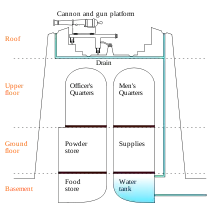 The interior of a classic British Martello tower consisted of two storeys (sometimes with an additional basement). The ground floor served as the magazine and storerooms, where ammunition, water, stores and provisions were kept. The garrison of 24 men and one officer lived in a casemate on the first floor, which was divided into several rooms and had fireplaces built into the walls for cooking and heating.[6] The officer and men lived in separate rooms of almost equal size. A well or cistern within the fort supplied the garrison with water. An internal drainage system linked to the roof enabled rainwater to refill the cistern.[6]