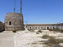 The British originally constructed River Fort Martello Tower in the early 19th century, on the site of a previous fort (presumed to have been built by the Spanish) to guard nearby River Landing, which was Barbuda's original quay. Confusion with the previous fort presumably explains the claims made in Barbudan tourism publications that this was the World's first, and is its oldest, Martello tower, built in 1745.[30] The tower is located on the south coast of the island, a mile or so from River Landing and some seven miles south of the island's main village of Codrington. The tower is 56 feet high, has a raised gun platform and extremely thick walls, but is missing the floors. It the first such tower constructed in the Caribbean, was built in 1745 by Sir William Codrington, and was designed by Commodore Charles Knowles RN, later Admiral Sir Charles Knowles Bt, who was then commanding the Leeward Islands station.[31]