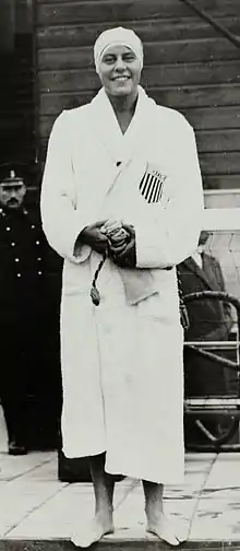 She was first recognized for her swimming and diving skills just after her seventh birthday, at an exhibition at the Greenbrier pool, where her father was a swimming instructor. He too had been an Olympic swimmer for Sweden and at the Summer Olympics 1912 in Stockholm offered a position in Florida to train the American swimming team. Daughter Martha became very good friends with top swimmer Johnny Weissmüller also trained by Marthas father Charles.[3] At the age of 15, she represented the United States at the 1924 Summer Olympics in Paris.[2][4] Norelius won the gold medal in the women's 400-meter freestyle in 1924, setting a new Olympic record (6:02.2), and edging fellow Americans Helen Wainwright (6:03.8) and Gertrude Ederle (6:04.8). Four years later, at the 1928 Summer Olympics in Amsterdam, she won two more gold medals. First, in individual competition, she won the women's 400-meter freestyle, breaking her own record with a new world mark of 5:42.8, and defeating Dutch swimmer Marie Braun by fifteen seconds. In the women's 4×100-meter freestyle relay event, Norelius and her American teammates Eleanor Garatti, Adelaide Lambert and Albina Osipowich, won the gold medal and set a new world record in both the event final (4:47.6).