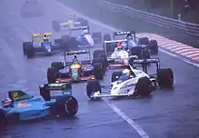Brundle had an unorthodox route to Formula One.[2] He began his racing career at the age of 12, competing in grass track racing,[3] in the Norfolk village of Pott Row.[2] In 1975, he moved to Hot Rod racing and received 'Star grade' status. In 1979, he started single seater racing in Formula Ford. During this time he also raced Tom Walkinshaw's BMW touring cars, during which he finished second against a field of international drivers at Snetterton. He won the BMW championship in 1980, and partnered Stirling Moss in the TWR-run BP/Audi team during the 1981 British Saloon Car Championship season. In 1982, he moved up to Formula Three achieving five pole positions and two wins in his debut season. He won the Grovewood Award as the most promising Commonwealth driver.[3] The next year, he competed with Ayrton Senna for the Formula Three championship, which Brundle lost on the final laps of the last race.[4] In 1984, he was offered a Formula One entry.