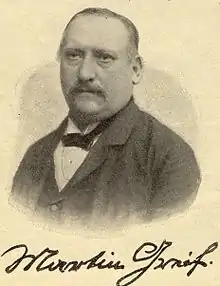 Friedrich Hermann Frey was born in Speyer, the son of Max Frey,[1] who had served as Kabinettsrat of Otto of Greece, and his wife Adelheid Friederike, née Ehrmann. The family moved to Munich, where he made the Abitur. He joined the Bavarian military and was promoted to Offizier in 1859. He retired from the military in 1867 to live as a freelance writer.[2] His first publications, enabled by Eduard Mörike were poems, published in 1868 by Cotta’sche Verlagsbuchhandlung unter the pen name Martin Greif, which he used as his official name from 1882 on.[2] In 1869 he moved to Vienna, where many of his plays were successfully performed at the Burgtheater, thank to its artistic director Heinrich Laube. When Laube left the post, Greif returned to Munich and wrote patriotic dramas performed at the Bavarian Court Theatre.