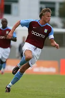 Laursen replaced Gareth Barry as club captain for Villa on a permanent basis for the 2008–09 season.[23] In Aston Villa's first game of the 2008–09 season, Laursen captained the side in the UEFA Intertoto Cup, and continued his goal-scoring record from set pieces by scoring Villa's second goal in the 2–2 draw against Danish team Odense BK.[4] Laursen also managed to get onto the scoresheet in a UEFA Cup match with FH Hafnarfjörður,[4] and against Stoke City in the Premiership.[4] On 23 October 2008, Laursen gave Aston Villa the lead in the UEFA Cup game against Ajax Amsterdam with a header from close-range.[4] Villa went on to win the match 2–1. He was named 2008 Danish Football Player of the Year in November 2008.[26]