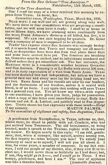 March 6, 1836 letter written by Martin Parmer to his wife from the Convention at Washington-on-the-Brazos on the day that The Alamo fell. This letter is from the April 9, 1836 edition of the Niles' Weekly Register. Immediately below the letter is the report of the famous Davy Crockett story regarding the voters of his Congressional district and how Crockett said that if they failed to re-elect him that "they might go to hell, and I would go to Texas."