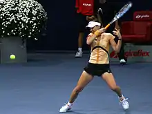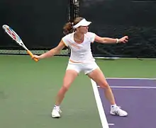 1999 saw Hingis win her third successive Australian Open singles crown as well as the doubles title (with Anna Kournikova). She had dropped her former doubles partner Jana Novotná.[30] She then reached the French Open final and was three points away from victory in the second set before losing to Steffi Graf about whom she had said before: "Steffi had some results in the past, but it's a faster, more athletic game now... She is old now. Her time has passed." She broke into tears after a game in which the crowd had booed her for using underhand serves and crossing the line in a discussion about an umpire decision.[31] After a shock first-round, straight set, loss to Jelena Dokić at Wimbledon,[32] Hingis bounced back to reach her third consecutive US Open final, where she lost to 17-year-old Serena Williams. Hingis won a total of seven singles titles that year and reclaimed the No. 1 singles ranking. She also reached the final of the WTA Tour Championships, where she lost to Lindsay Davenport.[29]
