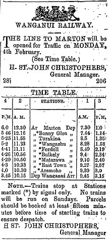The line from Whanganui to Turakina opened on Thursday 17 May 1877,[7] declared a public holiday by Whanganui's mayor.[8] Stewart & Co built the extension from Turakina to Marton.[9] The earthworks to Marton were said to be completed by the end of 1876.[10] However, trains weren't extended south until 4 February 1878.[11] Two months later there was criticism that Marton station was too small[12] and too far from the town;[13] in 1875 there had been a plan for the station to be 8 chains (530 ft; 160 m) further east, which would have been closer to the town centre.[14]