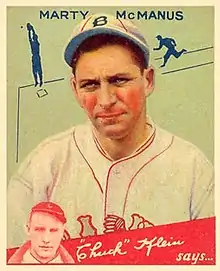 On August 31, 1931, the Tigers traded McManus to the Boston Red Sox for Muddy Ruel.[13] In 1932, the Red Sox compiled an 11–44 record through mid-June.[14] On June 19, 1932, the team's manager, Shano Collins, resigned his position, stating that he was so discouraged he could not go on. Team president Bob Quinn asked Collins where he could find a replacement, and Collins suggested McManus.[15] The Red Sox compiled a 32–67 record under McManus during the latter half of the 1932 season.[14] McManus was a player-manager in 1932, appearing in 93 games, including 49 at second base and 30 at third base.[1]