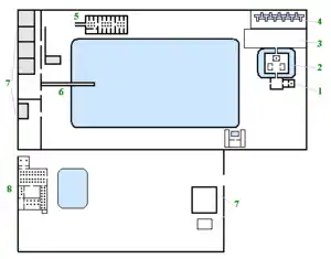 - The north-east corner of the large enclosure shows an artificial island surrounded by water. On the island a stone platform with offering tables was erected (2 on the plan).[4]