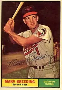Marv Eugene Breeding (May 8, 1934 – December 31, 2006) was an American professional baseball second baseman who played four seasons in Major League Baseball (MLB) for the Baltimore Orioles, Washington Senators and Los Angeles Dodgers between 1960 and 1963.[1] He batted and threw right-handed and was listed as 6 feet (1.8 m) tall and 175 pounds (79 kg).