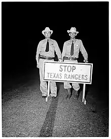 After showing his courage and valor dealing with the Ku Klux Klan, Burton was appointed a Texas Ranger in 1922 by Governor Pat Neff.[1] As a Ranger Burton was sent to the towns of Somerville and Borger, to clean up bootlegging and whiskey making operations.[1] On August 25, 1923 Texas Rangers Marvin Burton and R.D Shumate led a police raid on a large moonshining operation in Somervell County.[3] He became instrumental in helping maintain the law of Prohibition in Texas during its thirteen years. Recounting one encounter with a bootlegger Burton said, "the bootlegger started shooting. I returned the fire and they took him away to the Glen Rose funeral home".