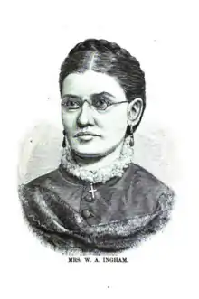 On March 22, 1866, she married William A. Ingham (died 1898), and removed to Cleveland. In 1870, she was chosen to inaugurate in northern Ohio the work of the Woman's Foreign Missionary Society. She presided over and addressed the first public meeting ever held in the city of Cleveland conducted exclusively by religious women. Afterward, she addressed large audiences in the various cities of Ohio, in Baltimore, Washington D.C., Buffalo, New York City, New Haven, and Minneapolis, upon the needs of the women of foreign lands. In March, 1874, being in charge of the praying community of her own city, she led for six weeks a very successful temperance crusade and was among the most active of Cleveland women in establishing inns, reading-rooms and chapels. She became chairman of the Pearl street inn, which for seven years did great work in the evangelization of the masses in the 9th, 10th and 11th wards of Cleveland. She was one of the original committee members in Chautauqua, New York that projected in August, 1874 the formation of the National Woman's Christian Temperance Union. That organizing convention met in Ingham's city on November 18–20, 1874.[4] Ingham served as treasurer of the national organization (1874–75), though she was primarily affiliated with the local chapter in Cleveland.[3]