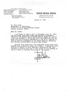 Koss joined the faculty of St. Olaf College as an assistant professor in August 1973.[2] She then transferred to a research university, Kent State in 1976.[2] During her time there, Mary Harvey, of Victims of Violence Center and National Institute of Mental Health, recruited her to lead a study on rape prevalence in collaboration with the Ms. Foundation for Research and Education. The project was federally funded through a competitive grants award process.[2] Koss' work resulted in the 1987 publication, "The Scope of Rape: Incidence and Prevalence of Sexual Aggression and Victimization in a National Sample of Higher Education Students."[2] This was the first national, large-scale survey on rape of its kind.[2] As a result of this and other works, Koss has been credited with coining the terms "date rape", "hidden rape", "unacknowledged rape", "acquaintance rape", and "campus rape". She also published "The Hidden Rape Victim: Personality, Attitudinal and Situational Characteristics." In that paper, she defined the hidden rape victim as, "one who has never reported her experience to a rape crisis center or to police."[3] Koss defined the unacknowledged rape victims as women who have experienced the behaviors that define rape (oral, anal, or vaginal penetration against consent through force, bodily harm, or when incapacitated and unable to consent) but do not realize that their experience constitutes rape or chose not to view it that way.[4] This is now a well-accepted finding reaffirmed by other investigators in national surveys repeated in the early 2000s and most recently reported in 2012. Koss has served as an invited speaker and guest lecturer around the world. In 1991, she testified as an expert witness at the U.S. Senate hearings that led to the first passage of Violence Against Women Act. Koss has since conducted multiple legislative testimonies, including expert witness testimonies to the U.S. Senate Veteran's Affairs Committee, US News and World Reports, Senator Cory Brooker on restorative justice, and US Advisory Commission on Child Abuse. Other legal testimony from Koss includes working with Congressional Briefing on Violence Against Women, and the Legislative Policy Brief released by the Evelyn Jacobs Ortner Center on Family Violence.