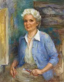 Mary Bryan painted in a variety of artistic media: oil, acrylics, tempera, decoupage, lacquer, ceramic, the fiber arts, in enamels, and at a potter's wheel.[8] However, she was her most masterful painting in watercolor, especially in depicting mountains, oceans, and rural scenes. It was reported by her family that "her hands were never idle and rising early in the morning, she would often be working in her studio before drinking her morning coffee."[9]