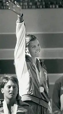 Four years later, when Seoul, South Korea hosted the 1988 Summer Olympics, she swam the freestyle leg for the silver medal-winning U.S. team in the women's 4×100-meter medley relay with teammates Beth Barr (backstroke), Tracey McFarlane (breaststroke), and Janel Jorgensen (butterfly).[2] The U.S. women's medley relay team was fraught with last-minute drama, as several previously selected swimmers dropped out to focus on individual events, or were replaced because they had performed below expectations, only hours before the event final.[13] In the event final, the U.S. medley relay team included women with no history of competing together, no relay exchange practice, and no coach; the East German favorites taunted the Americans before the race.[13] Wayte would later characterize the race as one of her proudest moments.[13] She also captured a bronze medal with the third-place U.S. women's 4×100-meter freestyle relay team that included Mitzi Kremer, Dara Torres and Laura Walker.[12] Individually, she finished fourth in the women's 200-meter freestyle; she was also a medal contender in the women's 200-meter individual medley, but was disqualified when the judges ruled she used an illegal butterfly kick on the breaststroke leg of the medley.[2][14]