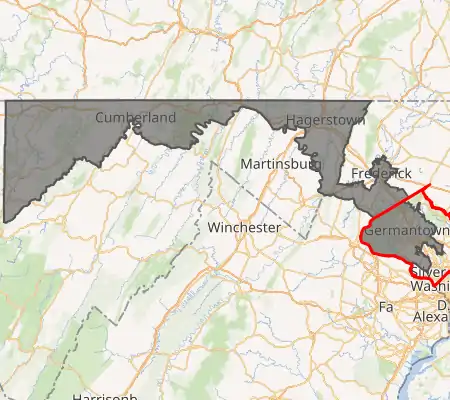 Interactive map of district boundaries, with Montgomery County highlighted in red. In the 2020 redistricting cycle, the district takes in the rest of Frederick County in exchange for some of Montgomery County. | |||