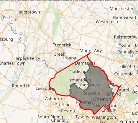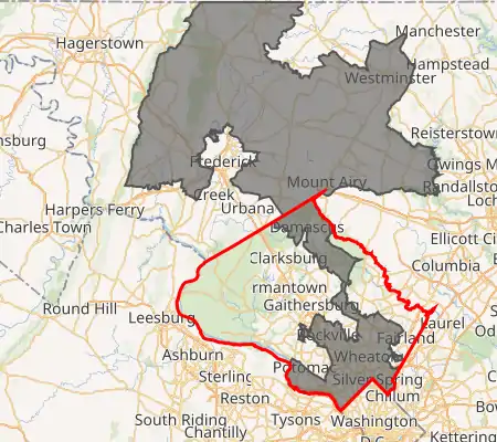 From 2003 to 2013 the district mostly consisted of the larger part of Montgomery County, also including a small portion of Prince George's County. The district now includes most of Frederick County (but not the City of Frederick), southern Carroll County, and a swath of Montgomery County that narrows in the north and then widens in the south to encompass nearly all of the area "inside the beltway." The redrawn district is slightly less Democratic than its predecessor. While the Carroll and Frederick portions of the district tilt strongly Republican, the Montgomery County portion has twice as many people as the rest of the district combined, and Montgomery's Democratic tilt is enough to keep the district in the Democratic column. Since Morella left office, no Republican has crossed the 40 percent mark.