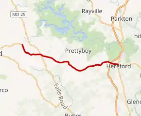 MD 137 begins at a three-way intersection with Gunpowder Road, which heads east toward Prettyboy Reservoir, and a county-maintained continuation of Mount Carmel Road west toward Hampstead. Mount Carmel Road becomes Lower Beckleysville Road on entering Carroll County and intersects MD 88 (Black Rock Road). MD 137 heads south as a two-lane undivided road and curves east and intersects MD 25 (Falls Road). The state highway continues east through farmland along the drainage divide between Gunpowder Falls to the north and its tributary Western Run to the south and passes its namesake church, now named Mount Carmel United Methodist Church. MD 137 meets Interstate 83 (I-83, Harrisburg Expressway) at a diamond interchange with ramps staggered into four intersections. A park and ride lot is located within the northwest quadrant of this interchange. Opposite the easternmost ramp, which is from northbound I-83 to MD 137, is unsigned MD 889, the access road to the Maryland State Highway Administration's Hereford Shop. East of I-83, MD 137 reaches its eastern terminus at a three-way intersection with MD 45 (York Road) 0.10-mile (0.16 km) north of the western terminus of MD 138 (Monkton Road).[1][2]