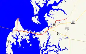 MD 18A's western terminus is at the beginning of state maintenance on Love Point Road just south of the community of Love Point at the northern end of Kent Island. The state highway heads due south as a two-lane undivided road through farmland. After meeting Old Love Point Road at an acute angle, MD 18A passes suburban subdivisions and Kent Island High School.[2] Love Point Road, which is unsigned MD 835C, veers southeast to pass through the Stevensville Historic District, which contains the historic Cray House, the Stevensville Bank building, and Christ Church. MD 18A curves to the southwest as Business Parkway. The state highway expands to a four-lane divided highway ahead of the intersection with MD 8. MD 8 continues south on the divided highway toward an interchange with US 50 and US 301 (Blue Star Memorial Highway) just east of the Chesapeake Bay Bridge while MD 18A turns east onto two-lane undivided Main Street. MD 18A curves around the southern edge of the Stevensville Historic District, intersecting Love Point Road, which is unsigned MD 759B to the south, and the other end of MD 835C (East Main Street). The state highway passes Stevensville Middle School, crosses Cox Creek, and passes the Kent Island Shopping Center before reaching its eastern terminus at a roundabout with Castle Marina Road, which is unsigned MD 18H to the south.[1][2]