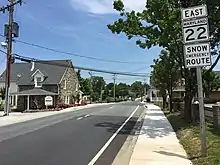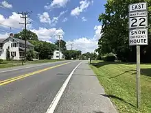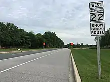 MD 22 was widened to 17 feet (5.2 m) with the addition of 3-foot (0.91 m) wide concrete shoulders around 1926, just before the highway became one of the original state-numbered highways in 1927.[10][11] The Post Road became part of US 40 the same year.[11] Both MD 22 and US 40 from Aberdeen to Havre de Grace were widened to 20 feet (6.1 m) by 1930.[12] US 40 was relocated from the Post Road to its present alignment from Aberdeen to Havre de Grace between 1930 and 1933.[12][13] MD 22 was extended north along the Post Road to MD 132B's present northern terminus by 1939.[14] Work to further modernize MD 22 began in 1951 when Churchville Road from Bel Air to MD 156 near Churchville was straightened, widened, and resurfaced.[15] The Bel Air–Churchville work was completed in 1953; the following year, the MD 22–MD 155 intersection was reconstructed.[16] MD 22 from MD 156 to US 40 in Aberdeen was widened and resurfaced between 1954 and 1956.[16][17]