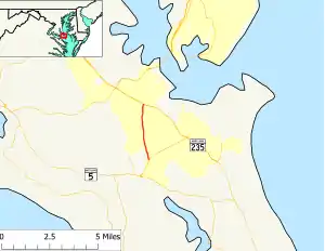 The original MD 237 roughly followed what is today MD 234 between Chaptico and MD 5 near Leonardtown via Clements.[3] The modern MD 237 was designated along what had been county-maintained Chancellors Run Road around 1987.[4] By 2003, heavy traffic along MD 237 related to greater activity at NAS Patuxent River led to the highway being marked for expansion.[5] Between 2008 and 2010, MD 237 was expanded from a two-lane undivided road to a four-lane divided highway from Pegg Road to MD 235. The speed limit on the road increased from 40 mph (64 km/h) to 45 mph (72 km/h) in 2015 [6]