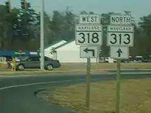 Maryland Route 318 (MD 318) is a state highway in the U.S. state of Maryland. The state highway runs 11.32 miles (18.22 km) from MD 16/MD 331 at Preston east to the Delaware state line near Federalsburg, where the highway continues east as Delaware Route 18 (DE 18). MD 318 connects Federalsburg with Preston and Bridgeville, Delaware. The state highway follows the Dorchester–Caroline county line for most of its length between Linchester and Federalsburg. The county line road is considered to be in Caroline County for maintenance purposes.[2] Further east, MD 318 runs concurrently with MD 313 to bypass Federalsburg. The portion of MD 318 west of Federalsburg was originally numbered Maryland Route 319 and assumed by MD 318 in the mid-1950s. The MD 319 section was constructed in the late 1910s near Federalsburg and completed west to MD 16/MD 331 in the late 1920s. MD 318 east of Federalsburg was built in the mid-1920s. MD 318 was placed on the bypass of Federalsburg in the early 1960s; its old alignment through Federalsburg became MD 315.