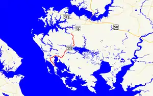 The road from Cambridge to Hooper's Island, which includes part of modern MD 16 and all of MD 335, was marked for improvement as one of the original state roads by the Maryland State Roads Commission in 1910.[3] However, the first section of MD 335, from just north of the Blackwater River to 1 mile (1.6 km) south of Church Creek, was not improved until it was paved as a state-aid road by 1921.[4] By 1923, pavement had been added from the southern end of the state-aid section south to Crossroads.[5] The section from Crossroads to Golden Hill was completed in 1925.[6] The section north of Blackwater River was reconstructed and extended to Church Creek by 1930.[7] MD 335 south of Golden Hill was completed in 1933.[8] The last piece of the state highway was a new bridge over Fishing Creek completed in 1934.[9] The Fishing Creek Bridge was replaced in 1991 and 1992 contemporaneously with new bridges over the Blackwater River, Great Marsh Creek, and Spicer Creek.[10][11][12][13]
