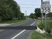 MD 358 was first constructed in 1925 along Somerset Avenue south from the Crisfield city limits and east along Asbury Road to Lawsonia Road, which later became MD 380.[3][4] The Asbury Road segment connected Crisfield with Sackertown Road, which was once MD 360.[5] Another section of MD 358 was paved from the Pennsylvania Railroad (now the MD 413 corridor) to its present northern terminus in 1933; this segment was originally designated MD 475.[6][5] MD 358 was extended north along Somerset Avenue to Chesapeake Avenue (MD 667) by 1939 and to its present northern terminus by 1946, assuming MD 475.[5][7] The state highway along Somerset Avenue was widened from Main Street to MD 413 around 1954.[8] MD 358 was removed from the state highway system south of MD 413 by 1995.[9] The state highway was relocated at Box Iron Road to eliminate two sharp curves between 1988 and 1999.[10][11]