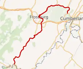 In Barrelville, MD 36 intersects MD 47, which connects it with PA 160 in Somerset County.[1] From its intersection with MD 47 to its terminus at Cumberland, MD 36 follows newer alignments, with the old alignments being designated MD 831. At Corriganville, MD 36 intersects MD 35, which connects it with PA 96 in Bedford County.[1] MD 36 ends at US 40 Alt. at the Narrows near Cumberland.[1]