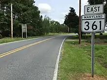 Maryland Route 361 (MD 361) is a state highway in the U.S. state of Maryland. Known as Fairmount Road, the state highway runs 5.62 miles (9.04 km) from the beginning of state maintenance in Upper Fairmount east to MD 413 in Westover. MD 361 provides access to the villages of Manokin and Upper Fairmount. The state highway was constructed from the Westover end beginning in 1926. MD 361 was completed west through Upper Fairmount in the early 1930s.