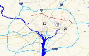 The Prince George's County section has seen more substantial changes over the intervening decades. The first major change in alignment occurred in 1956, when MD 410 was completed on a new alignment as a four-lane divided highway between Ager Road (just east of MD 212) and MD 500.[16][17]