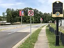 MD 431 begins at an intersection with MD 201 (Kenilworth Avenue) in Riverdale Park in Prince George's County. From here, the route heads west on River Road, a four-lane divided highway. The road crosses the Northeast Branch Anacostia River in a wooded area before it comes to a roundabout at University Research Court/Haig Drive. The route crosses into College Park and curves north, running past business parks and passing to the east of the College Park–University of Maryland station that serves MARC's Camden Line and Washington Metro's Green and Yellow lines. MD 431 turns northwest onto four-lane undivided Campus Drive and passes under CSX's Capital Subdivision, which carries MARC's Camden Line, and Washington Metro's Green and Yellow lines. The route runs past commercial development before it curves west and heads between Paint Branch Stream Valley Park to the north and residential areas to the south. The road turns to the north and runs between commercial development to the west and wooded areas of the park to the east. MD 431 curves northwest and becomes a divided highway before it reaches its terminus at an intersection with US 1 (Baltimore Avenue) on the eastern edge of the University of Maryland at College Park campus.[1][2]