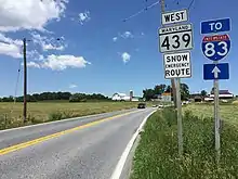 Maryland Route 439 (MD 439) is a state highway in the U.S. state of Maryland. Known as Old York Road, the state highway runs 7.19 miles (11.57 km) from MD 45 in Maryland Line east to MD 23 in Shawsville. In conjunction with MD 23 and Interstate 83 (I-83), MD 439 connects Bel Air with York, Pennsylvania. The state highway was constructed at both ends in the early 1930s. The middle section of MD 439 was brought into the state highway system around 1980.