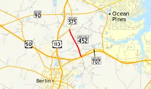 Maryland Route 452 (MD 452) is a state highway in the U.S. state of Maryland. Known as Friendship Road, the state highway runs 1.64 miles (2.64 km) from U.S. Route 50 (US 50) near Berlin north to MD 575 in Friendship in northern Worcester County. MD 452 was built as a cut-off between US 213 (now US 50) and US 113 (now MD 575) in the early 1930s.