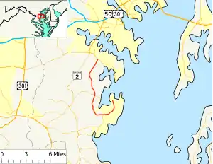 MD 468 originally included Muddy Creek Road from MD 255 north to Edgewater. The portion of MD 468 from MD 255 to Shady Side was part of MD 255 and the highway from the MD 255–MD 468 intersection east to Galesville was MD 393.[3] The first work done along MD 468's modern course was grading work from the MD 255–MD 468 intersection south to Sudley Road in 1920.[4] The gravel highway was completed between those intersections in 1921 and proposed to extend to the modern intersection with MD 256.[5] The highway extended to Deep Creek Road on the south side of Shady Side in 1923.[6] MD 255 was completed to Shady Side in 1929 and 1930.[7][8] MD 468 was constructed in three sections. The first section from MD 253 (now MD 214) south to near Collins Road was started in 1930 and completed as a gravel road by 1933.[7][9] The highway was extended south to Lansdale Road in 1932 and 1933.[9][10] MD 468 was completed to MD 255 in 1933 and 1934.[10][11] By 1934, traffic on the Galesville–Shady Side segment was dense enough that the road was recommended to be widened from 16 to 20 feet (4.9 to 6.1 m).[10] MD 468 was extended south along MD 255's route to Shady Side and MD 255 replaced MD 393 into Galesville in 1949.[12] MD 468 originally followed what are now Old Muddy Creek Road and Clydesdale Road.[13] Those curvaceous segments were replaced with the current straighter alignment in 1960.[14] MD 468 once extended a short distance along Snug Harbor Road from its present terminus in Shady Side.[15] The highway was retracted to its present terminus by 1987.[16]