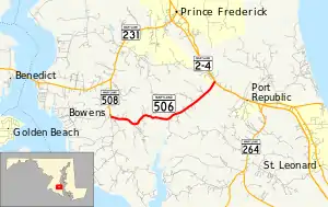 Maryland Route 506 (MD 506) is a state highway in the U.S. state of Maryland. Known as Sixes Road, the state highway runs 3.79 miles (6.10 km) from MD 508 in Bowens east to MD 2 and MD 4 near Port Republic. MD 506 provides access to Battle Creek Cypress Swamp. The state highway was constructed from MD 2 to the swamp in the early 1930s and extended to Bowens in the late 1950s.