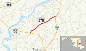 Maryland Route 578 (MD 578) is a state highway in the U.S. state of Maryland. Known as Bethlehem Road, the state highway runs 4.24 miles (6.82 km) from MD 331 at Bethlehem east to MD 16 at Harmony. The first segment of MD 578 was completed in the mid-1930s; the remainder was built in the early 1940s.