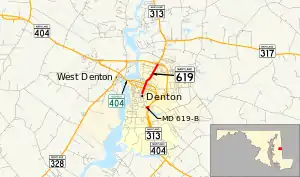 Maryland Route 619 (MD 619) is a state highway in the U.S. state of Maryland. Known as Sixth Street, the state highway runs 1.09 miles (1.75 km) from an intersection with 5th Avenue north to an interchange with MD 313 and MD 404 within the town of Denton in central Caroline County. MD 619 is the old alignment of MD 313 and part of MD 404 through Denton. The state highway was designated south of present MD 404 Business when MD 404 and MD 313 were relocated on the south side of Denton in the early 1970s. MD 619 was extended to its current length when MD 404 and MD 313 were moved to the Denton Bypass in 1987.
