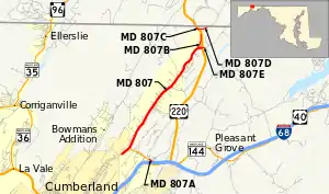 Maryland Route 807 (MD 807) is an unsigned state highway in the U.S. state of Maryland. Known as Bedford Road, the state highway runs 3.52 miles (5.66 km) from the city limits of Cumberland north to U.S. Route 220 (US 220) in Dickens. MD 807 is the original alignment of US 220 north of Cumberland. The state highway was assigned to the portion of highway between the city line and Naves Cross Road, presently MD 144, after US 220 was moved to Interstate 68 through downtown Cumberland in 1982. MD 807 was extended to its present northern terminus when the US 220 Bedford Road bypass opened in 2000.